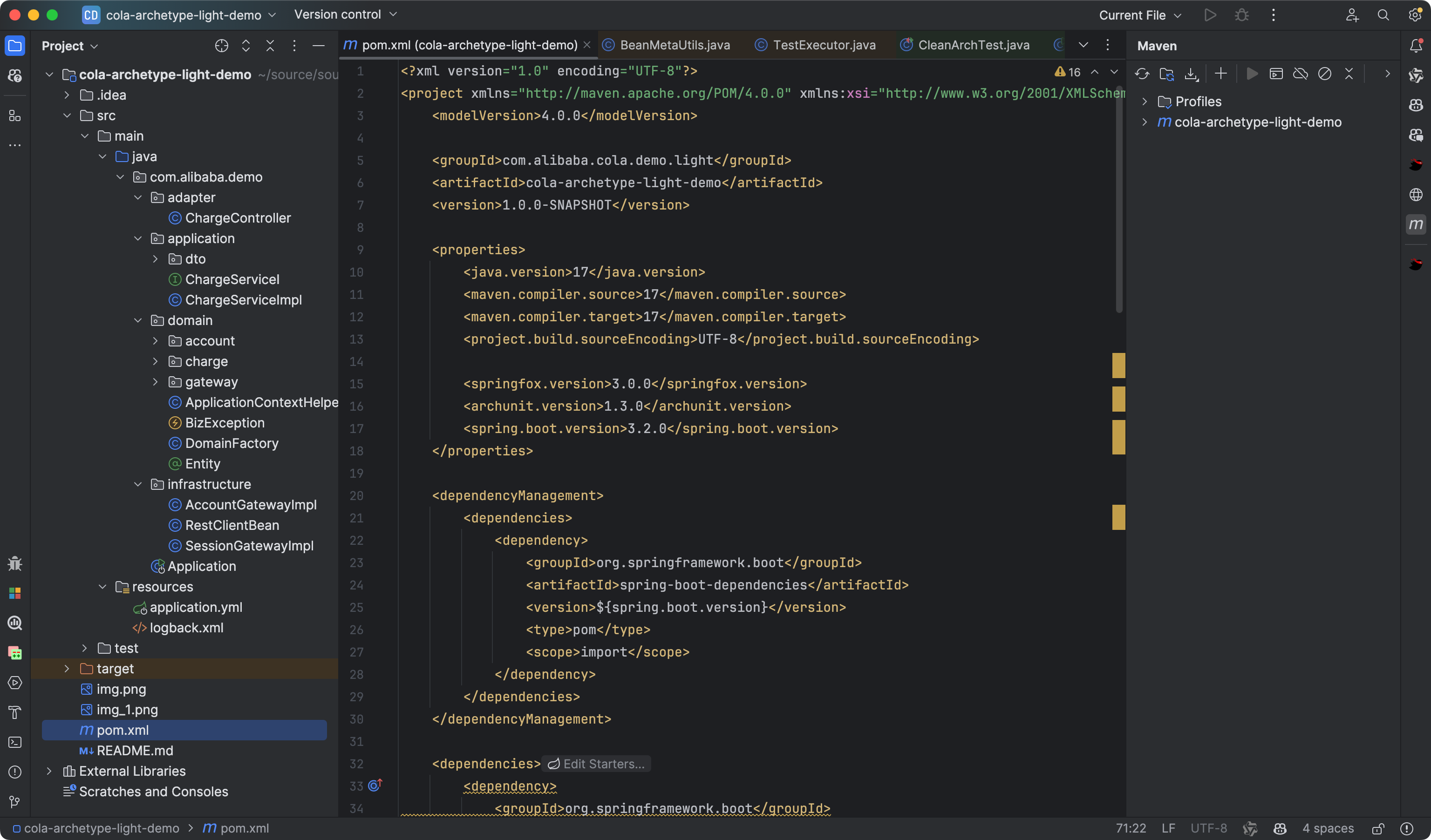 并提供了 maven archetype,虽然 README 没有提及 cola-archetype-light 的命令和使用方式,但是替换名称是可以使用的。