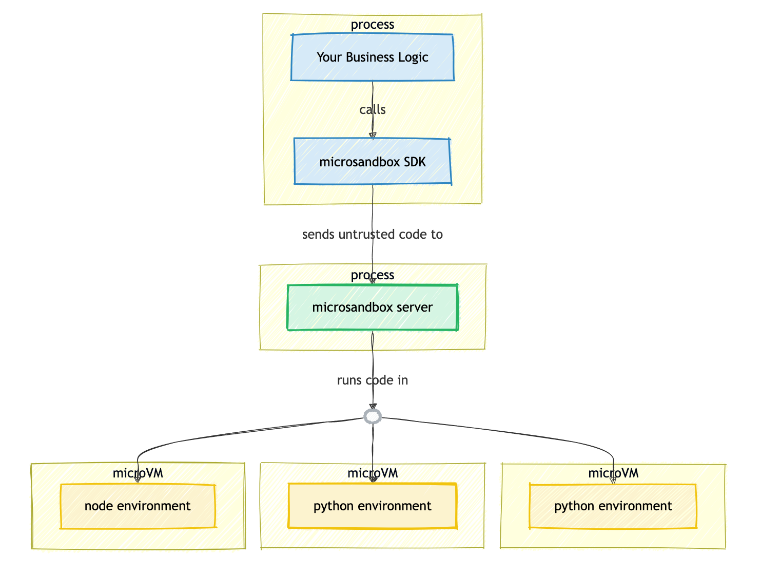 - Microsandbox SDK:作为连接桥梁,负责将需要执行的不可信代码进行封装,并安全地发送给服务端。